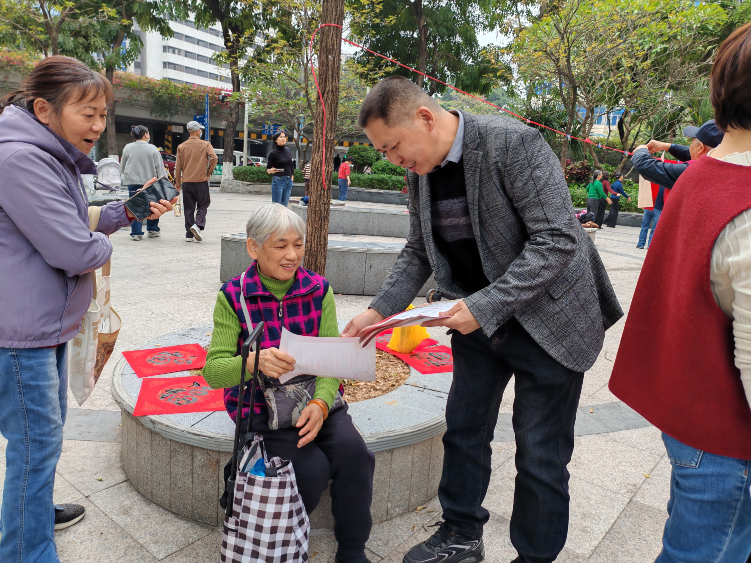 黄花新村社区小广场活动现场持续升温,书法爱好者与红棉老兵们挥毫书写寓意吉祥的春联与福字,“平安喜乐”“国泰民安”等字样饱含美好期许,同时也将安全守护的理念融入笔墨之间。红棉老兵们退役不退志、退伍不褪色,主动参与安全宣传活动,向居民们耐心宣讲安全知识,结合实际案例提醒大家时刻紧绷安全弦,用接地气的语言让安全知识深入人心。