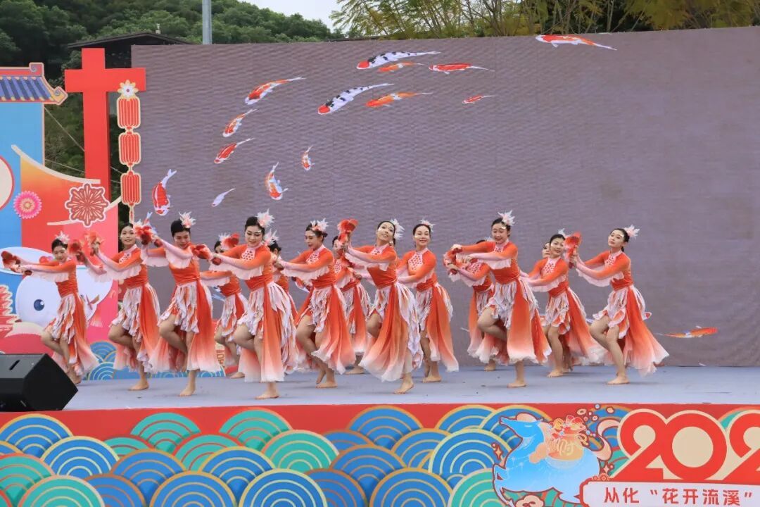 “花开流溪”村晚以“流溪春韵・万象更新”“家园恋曲・幸福回响”“奋进新程・共赴春光”三大篇章展开。下午4点30分左右,女子群舞《流溪烟渚》拉开了村晚的序幕,婀娜多姿的身形伴随着音乐翩翩起舞,仿佛将人们带入了流溪河畔那如诗如画的意境之中。交响乐弦乐四重奏《赛马》《一步之遥》以其激昂的旋律和精湛的演奏技巧,瞬间点燃了现场观众的热情,让大家沉浸在音乐的海洋中。广场舞《鱼游春水》则以其欢快的节奏和灵动的舞姿,展现了乡村生活的活力与美好。歌舞《爱你百千万》深情唱出了对“百千万工程”的赞美与期待,旋律悠扬,歌词质朴,引发了现场观众的强烈共鸣,大家纷纷跟着节奏鼓掌、哼唱。龙门农民画旗袍秀《大地画语》将传统绘画与现代服饰美学巧妙融合,让现场观众沉浸式感受文化传承与创新的魅力。