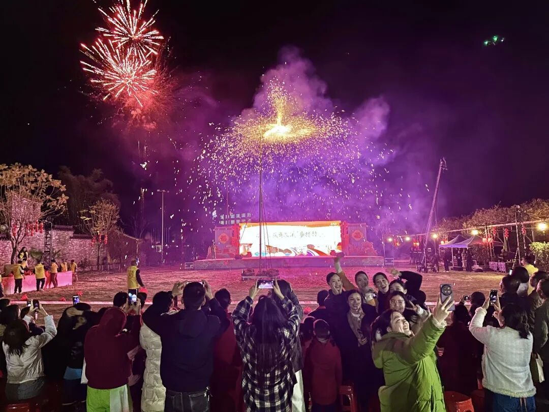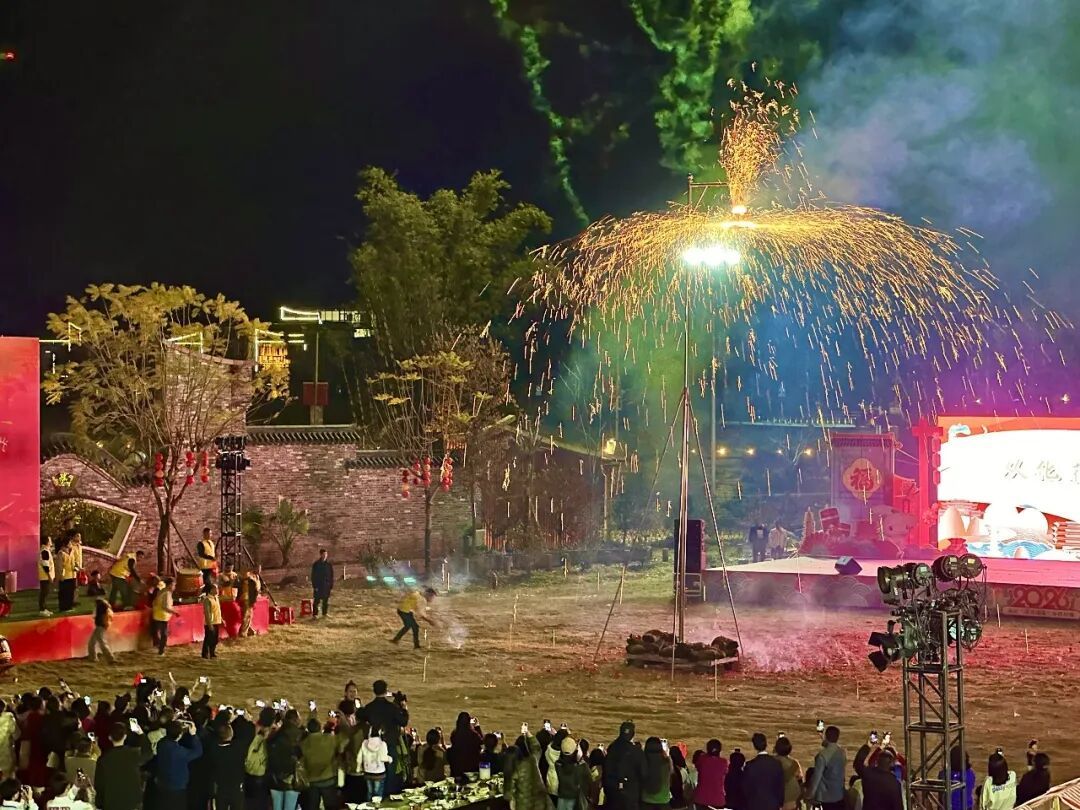 最后,非遗文化掷彩门压轴登场。村民们注视着那被高高挂起的彩门,仔细留意着每一串被扔上高空的鞭炮,观察其是否成功点燃彩门。当彩门被成功点燃后,伴随着浓烟,旋转的彩门绽放出绚烂的火花,瞬间照亮了整个夜空,也点燃了现场观众的热情。大家欢呼雀跃,掌声雷动,共同庆祝这一美好时刻。掷彩门作为从化地区的传统民俗活动,不仅承载着人们对新年的美好祝愿,更展现了乡村文化的独特魅力。