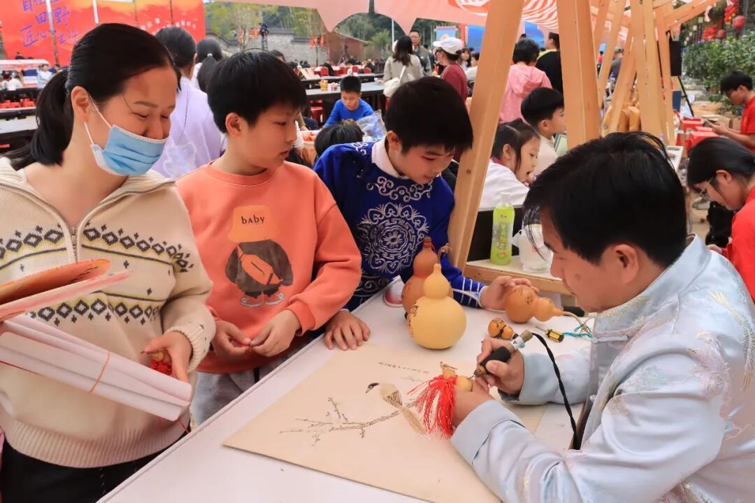 在非遗文化体验区,非遗木工技艺、非遗竹编、非遗扎染、非遗漆艺等摊位依次排开,吸引众多村民驻足体验。大家在工作人员的指导下,亲手制作木工小物件、编织竹篮、绘制漆扇,感受传统技艺的独特魅力,现场不时传来惊叹声和欢笑声。此外,活动现场还摆放了近百件非遗工艺品,如铜工艺荣耀归来马、铜工艺金鳞瑞祥、陶工艺掐丝珐琅象耳瓶等,这些工艺品造型精美、工艺精湛,引得村民们纷纷驻足观赏,拍照留念。