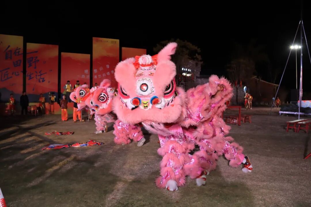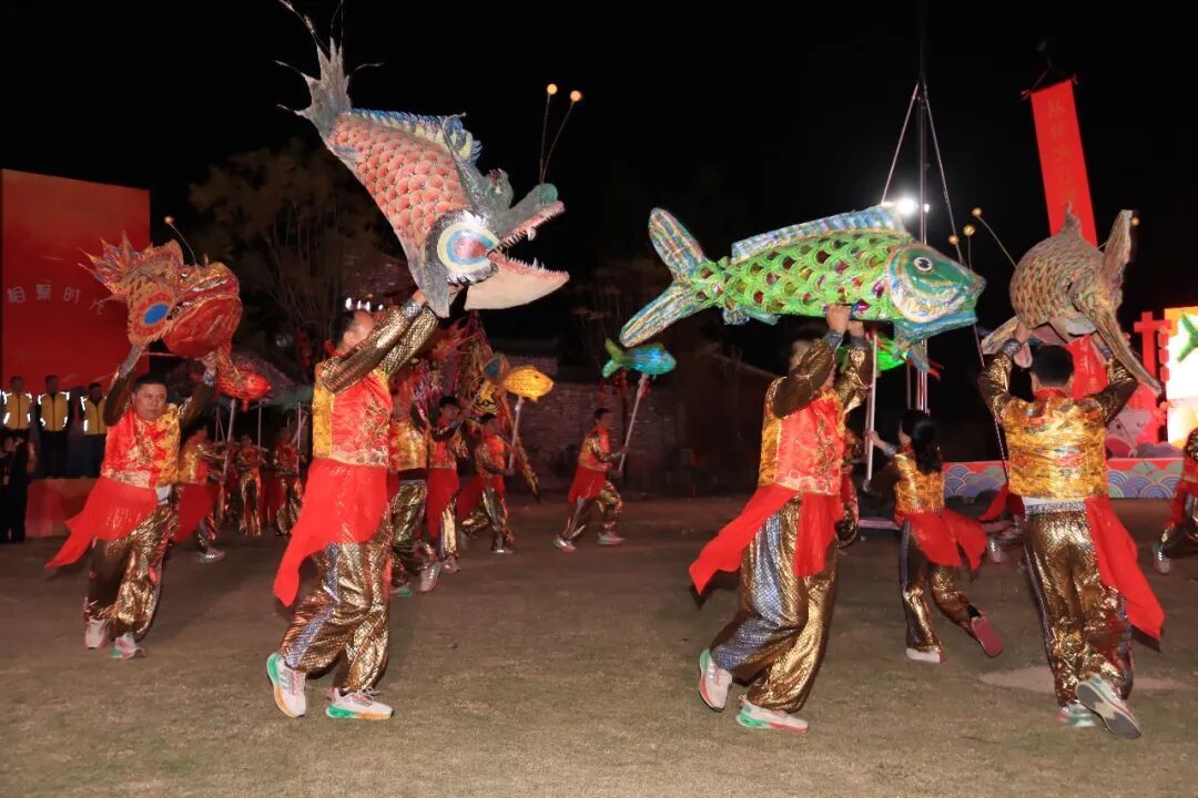 晚宴结束后,精彩继续进行。《醒狮表演》在夜幕的映衬下更显威风凛凛,醒狮们时而跳跃、时而翻滚,灵动的身姿引得现场观众阵阵喝彩,将乡村的夜晚渲染得热闹非凡。紧接着,非遗文化《水族舞》闪亮登场,舞者们身着特色服饰,手持鱼形道具,在灯光下翩翩起舞,仿佛将人们带入了一个神秘而美丽的水下世界,引得观众纷纷拍照留念。
